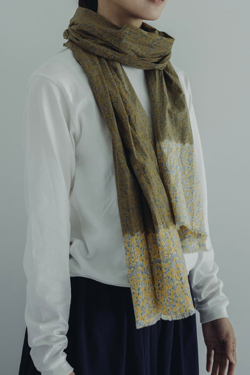 1950年代の英国リバティ柄の上から伝統工芸士の手で、絞り染めたマフラー。
